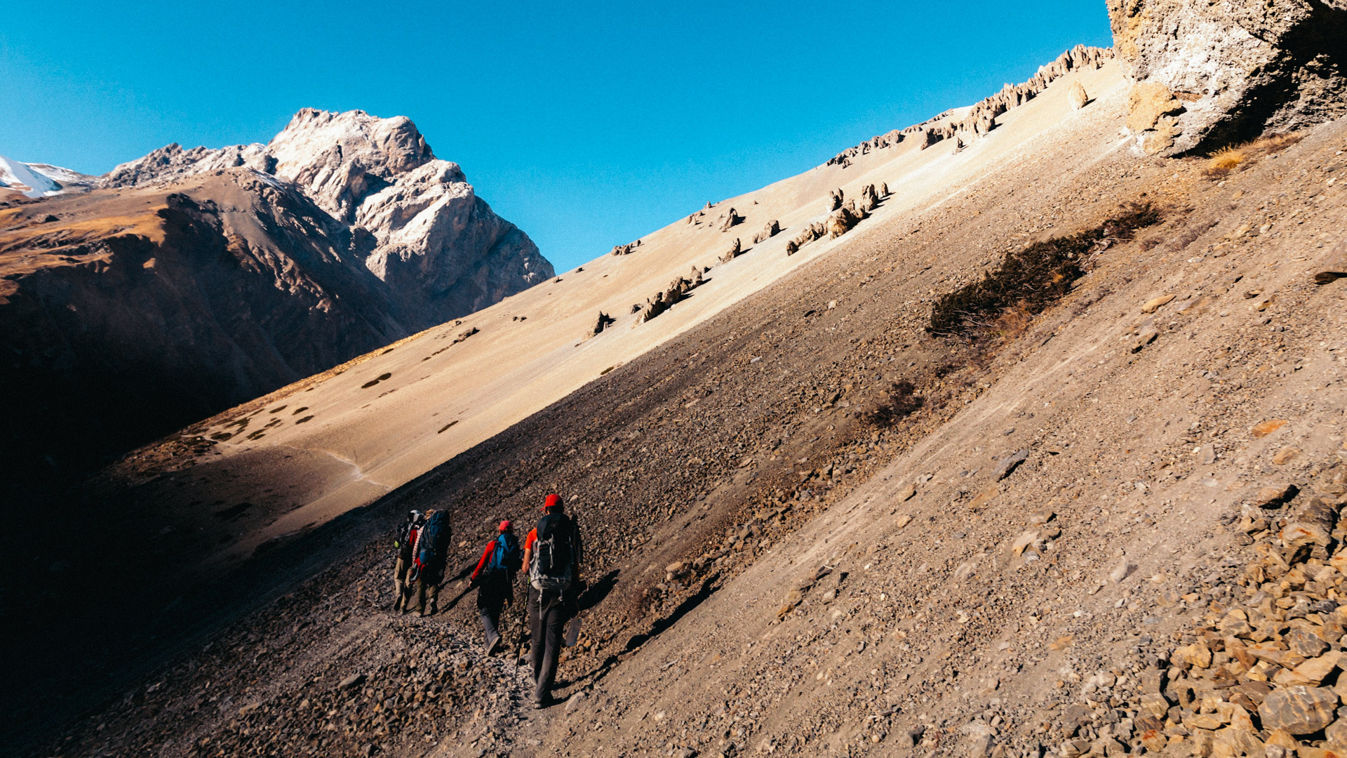 Стараемся проснуться до восхода солнца, потому что вместе с ним просыпается и сильный встречный ветер, несущий пыль и снежную крошку. Через 3–4 часа мы поднимемся на 5416 метров, откуда будут открываться величественные виды на Дхаулагири, а вдали — земли Верхнего Мустанга и Тибетского плато. Далее тропа поведет нас вниз к святой долине Муктинатх — месту паломничества, почитаемому и индуистами, и буддистами. Считается, что тот, кто побывает здесь, обретет духовное освобождение.