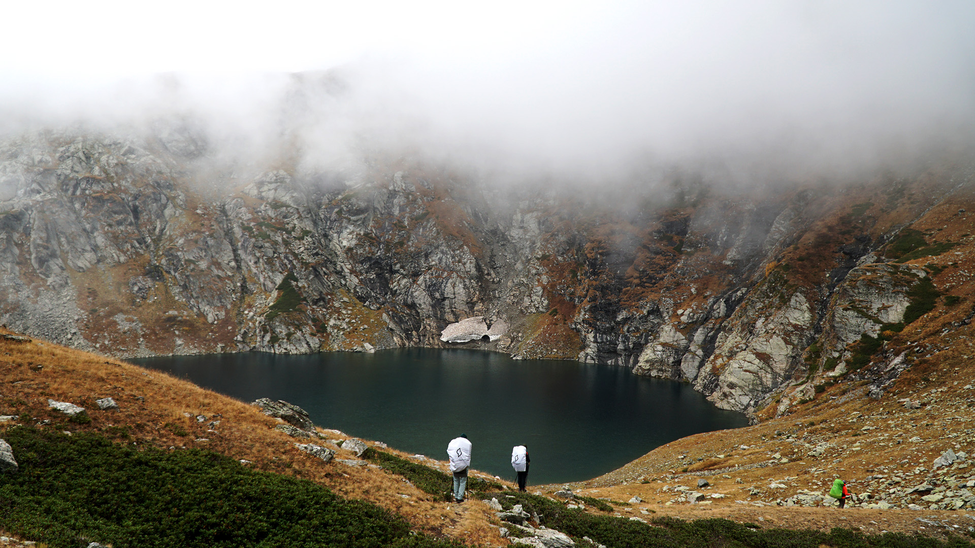 Собираем лагерь и поднимаемся через перевал Кынхара, с которого открывается вид на озёра Удачи и Кварцевое. Проходим мимо них и останавливаемся у озера Голубого, обрамленного скальным цирком.