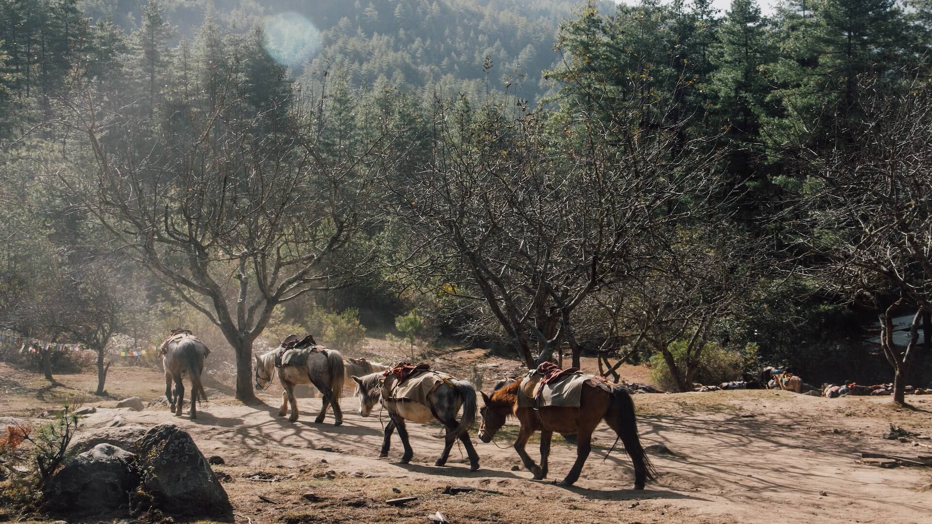 Сегодня стартует походная часть нашей истории по бутанским Гималаям — трек Джомолхари. Трек почти полностью проходит в национальном парке Джигме Дорджи — вторым по величине национальном парке Бутана и одним из самых биологически богатых регионов Гималаев. Он расположен в высотном диапазоне до 6000 метров и охватывает все три климатические зоны страны. Это единственная охраняемая территория в Бутане, где вы можете увидеть национальные символы в одном месте. Кипарис символизирует долголетие и бессмертие, невероятной красоты голубой мак воплощает красоту страны и символизирует счастье, ворона — символ мудрости, а такин — животное, которое символизирует силу и защиту. Ранний завтрак, затем переезд в Шана Зампа на севере долины Верхнего Паро. Сегодня мы пройдём через пышный лес из дуба, бамбука и рододендронов, следуя вдоль реки Паро до места, где разобьём лагерь.