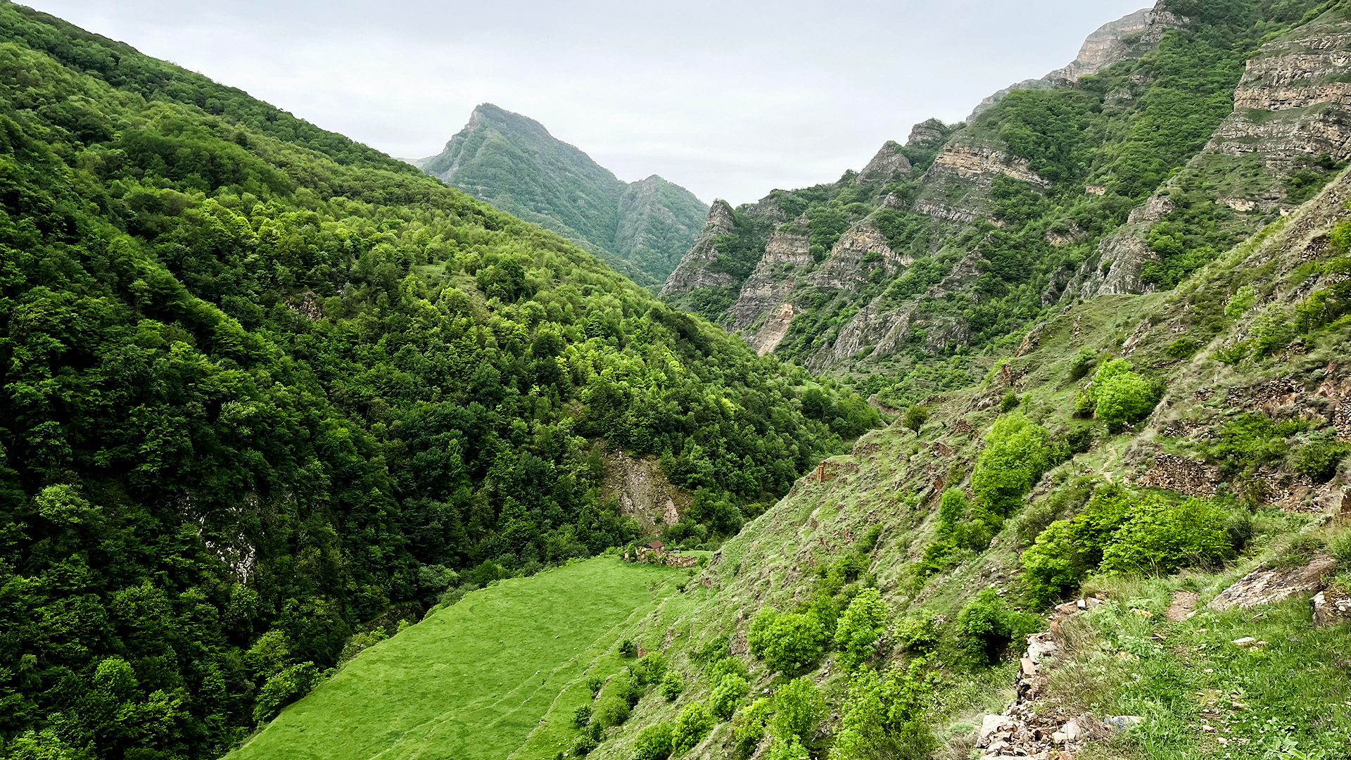 Спускаемся в долину и идем по извилистой тропе вдоль реки. Долина постепенно сужается и превращается в каньон с отвесными скалами, покрытыми лесом. Поднимаемся вверх, тропа идет по борту каньона. Выходим к горному селу, опустевшему несколько десятков лет назад, и ставим палатки.
