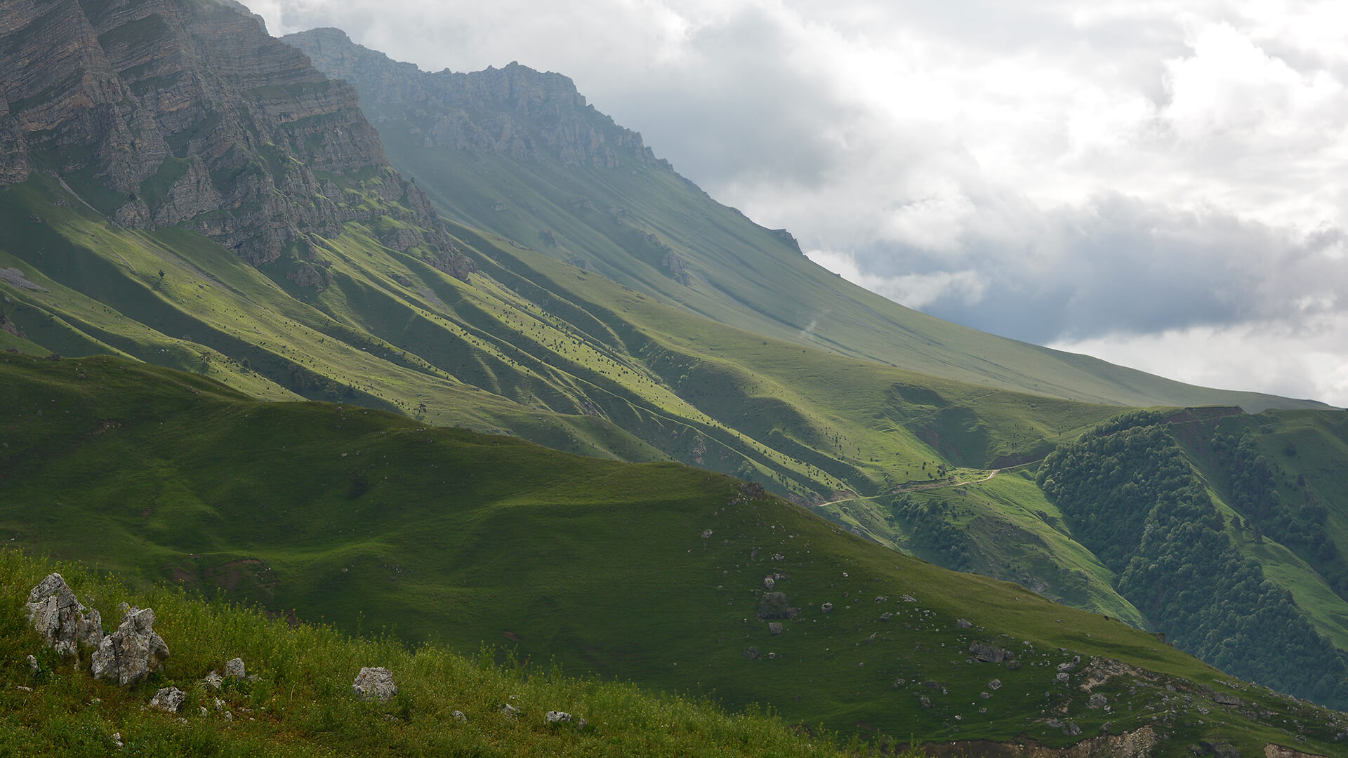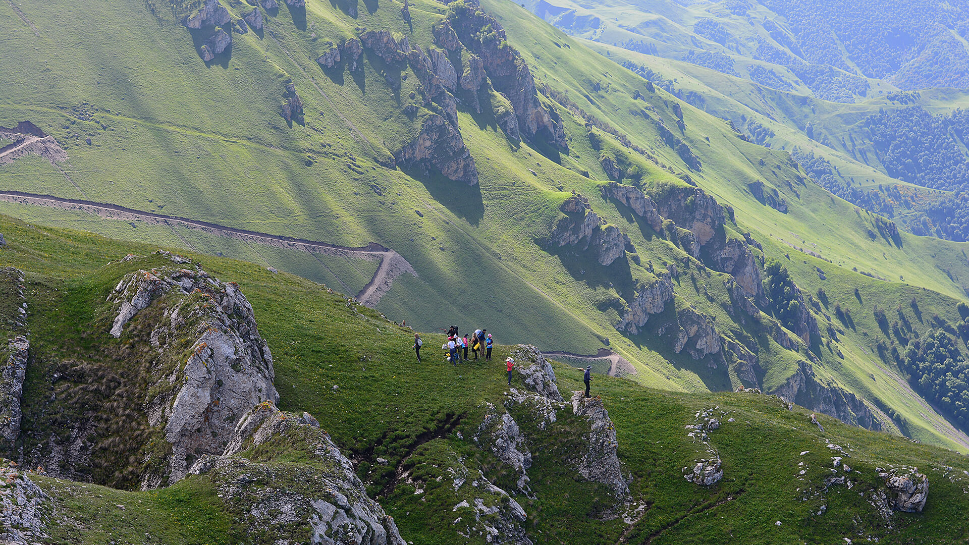 Выбираемся на целый день на перевал Гиряг, откуда открывается великолепный вид на горную Ингушетию, Казбек и главный хребет Кавказа. После этого возвращаемся в альплагерь.