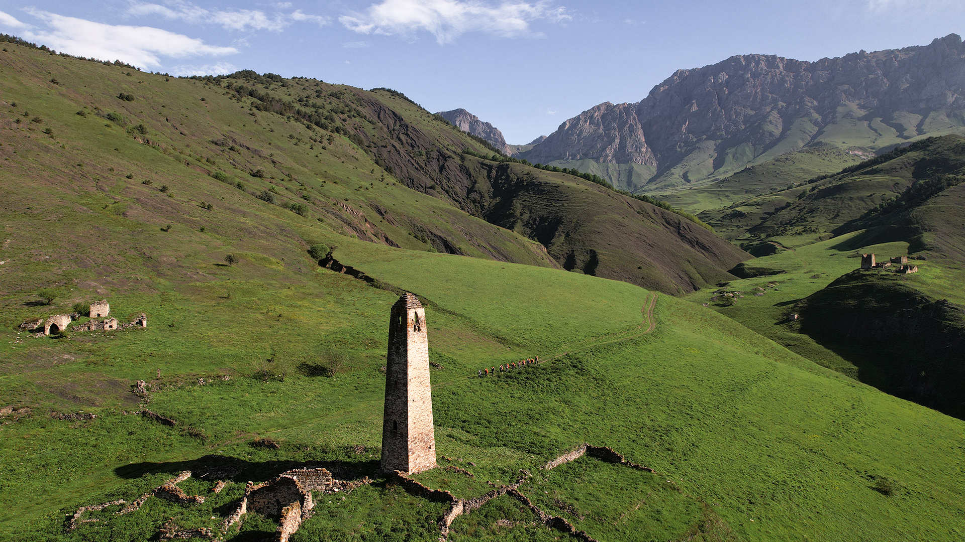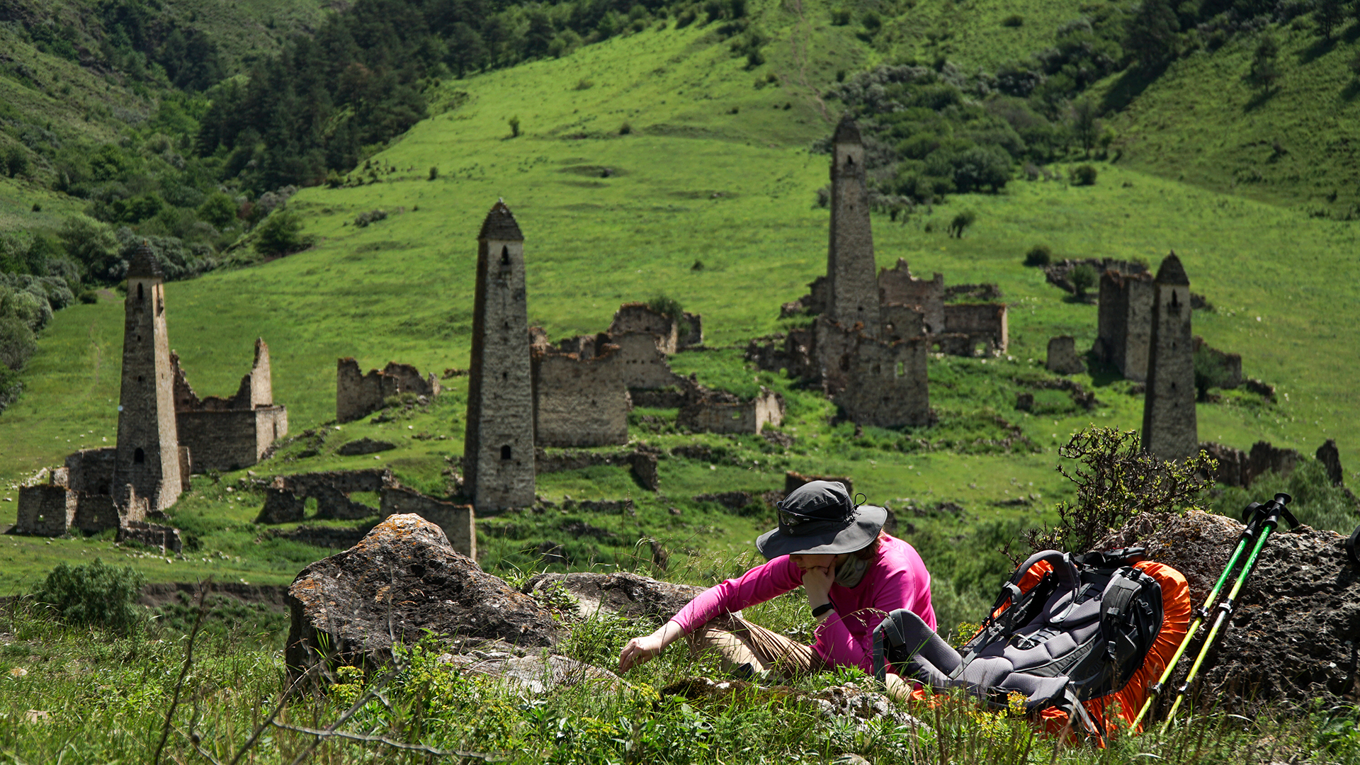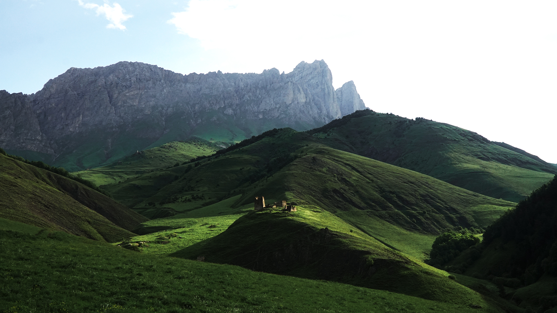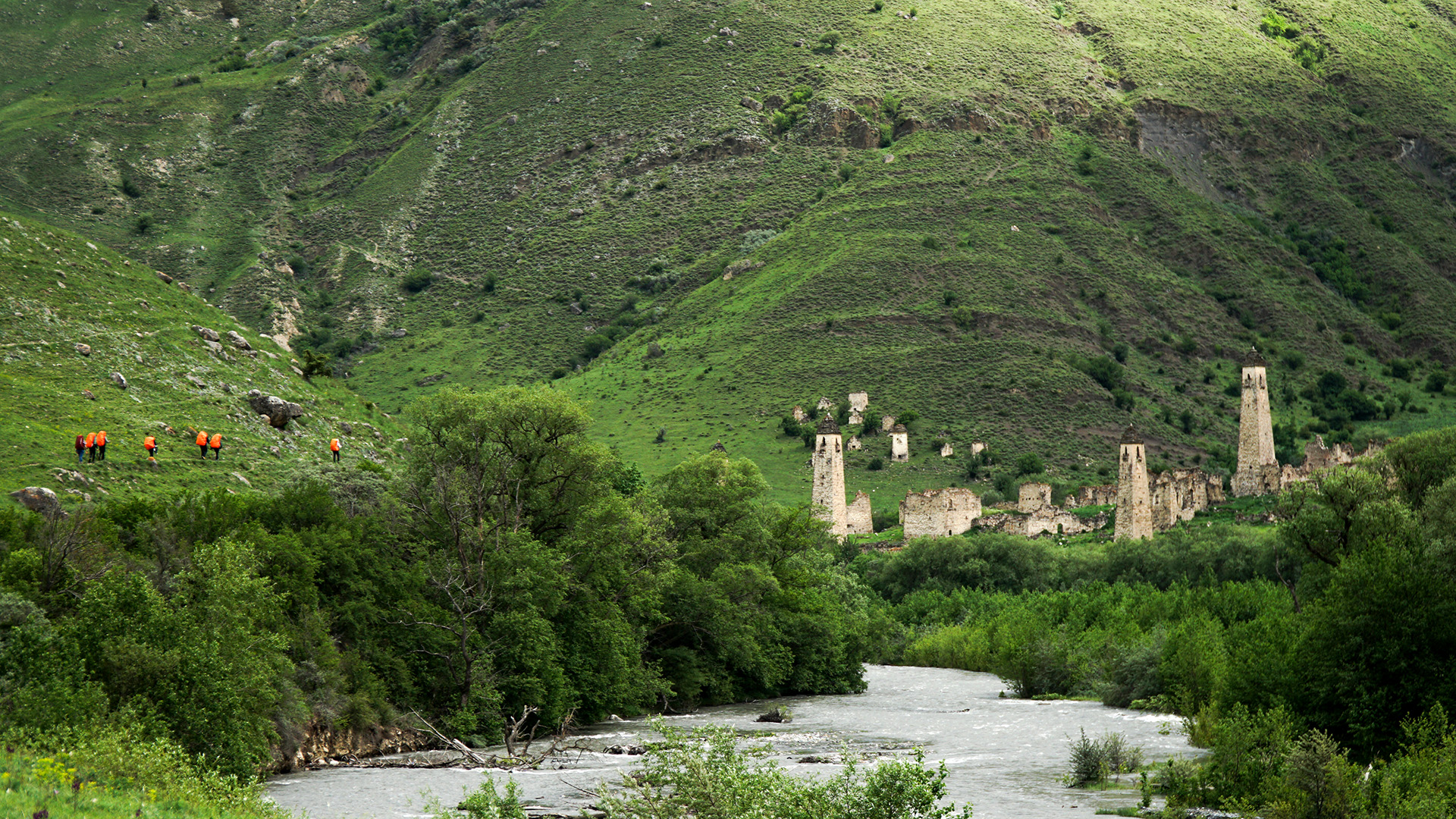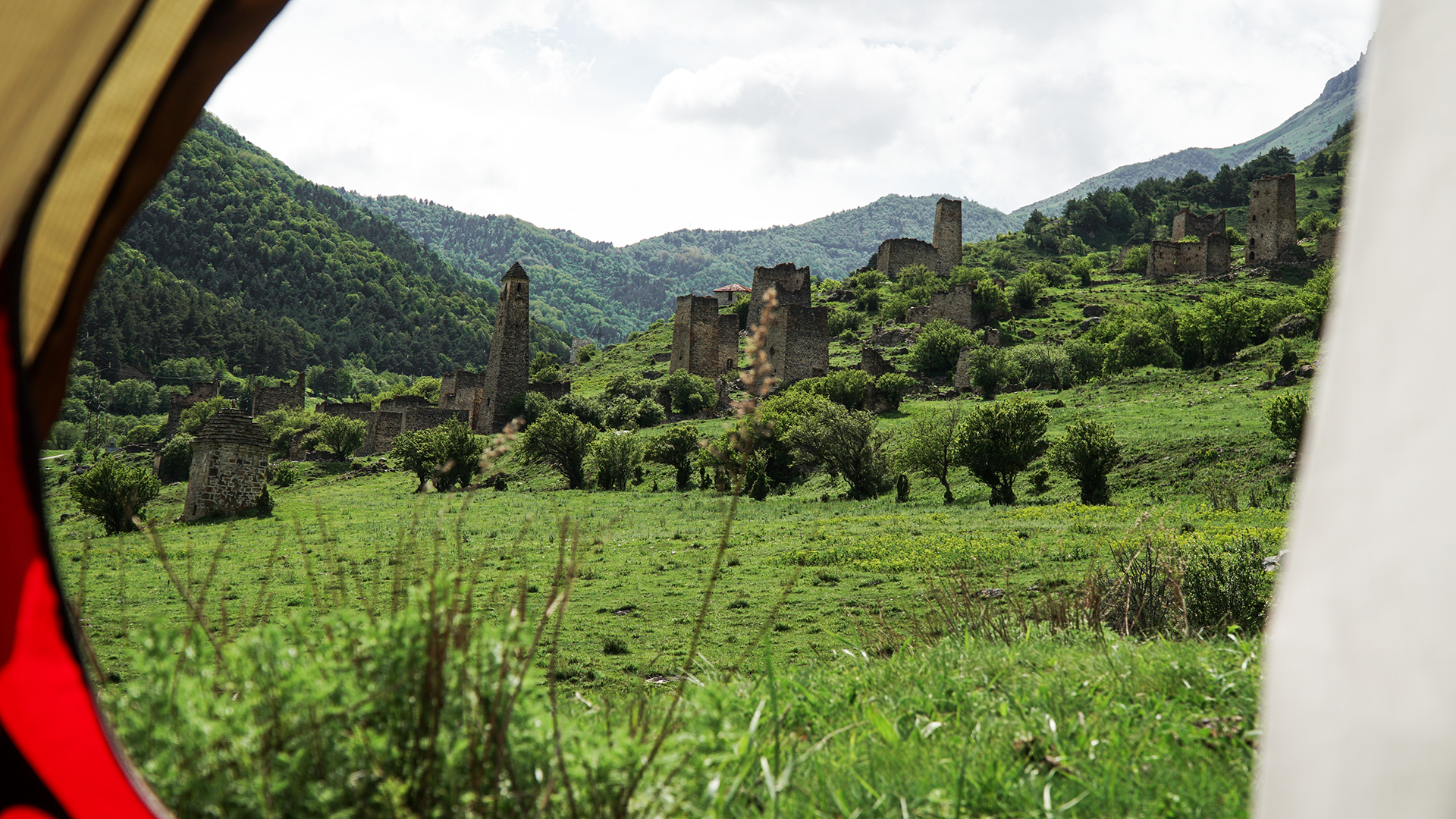 По живописной долине проходим сразу несколько групп родовых башен, а затем добираемся до одного из крупнейших башенных комплексов Ингушетии. Ставим лагерь на поляне у ручья по соседству с полуразрушенным древним поселением. Проводим вечер с видами на Казбек и заснеженные горные хребты.