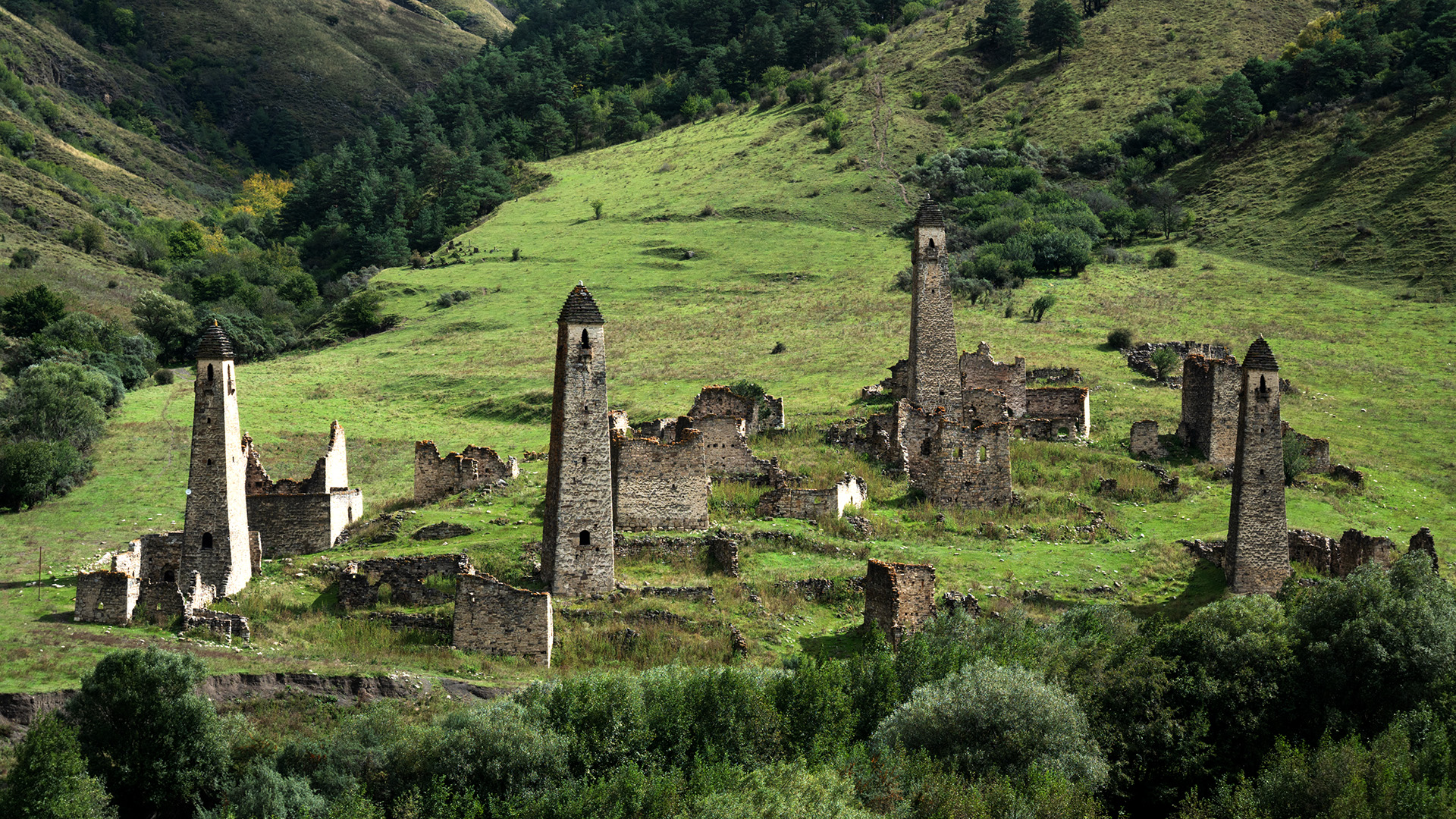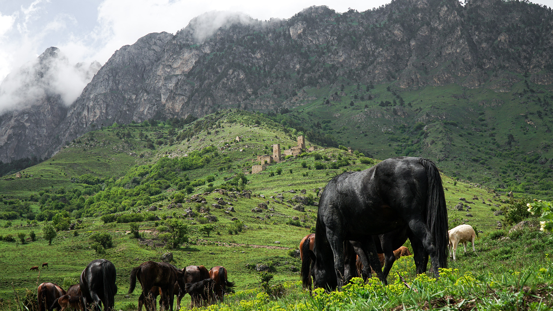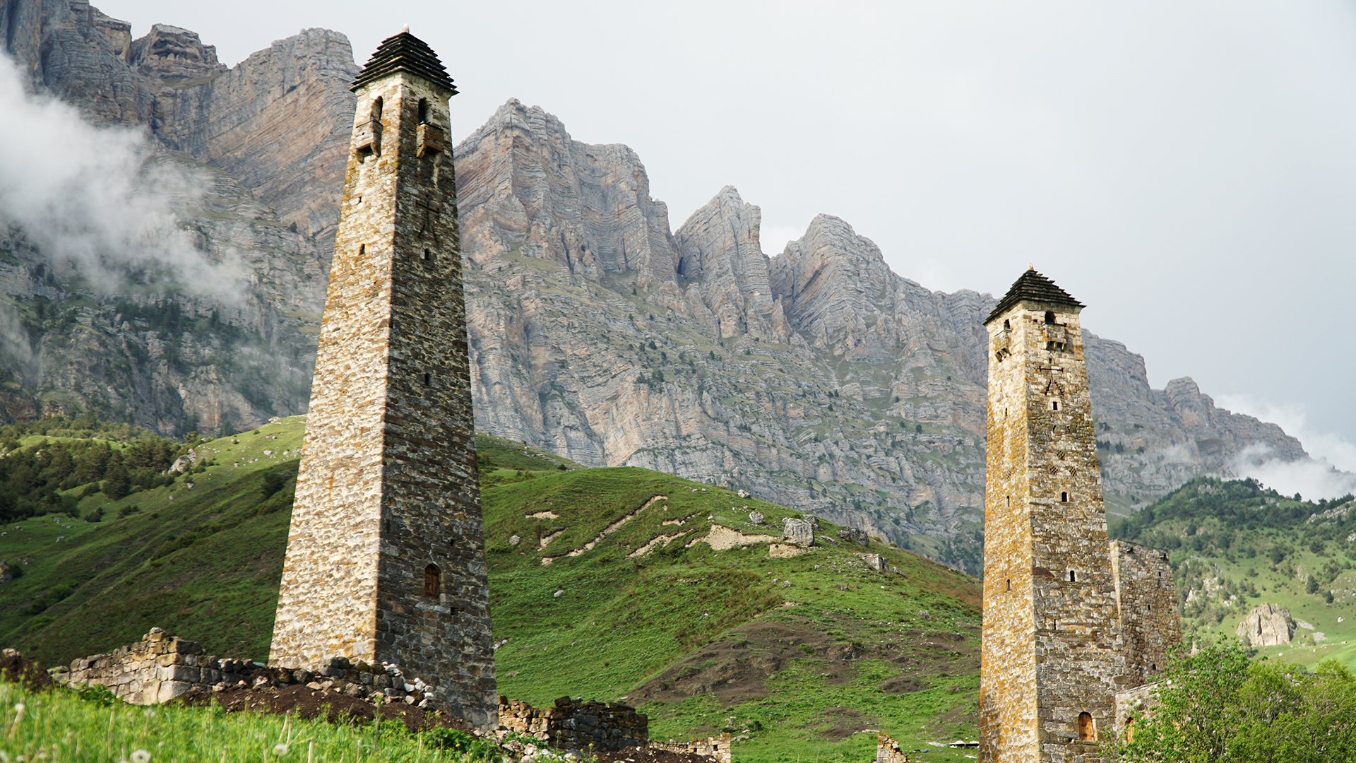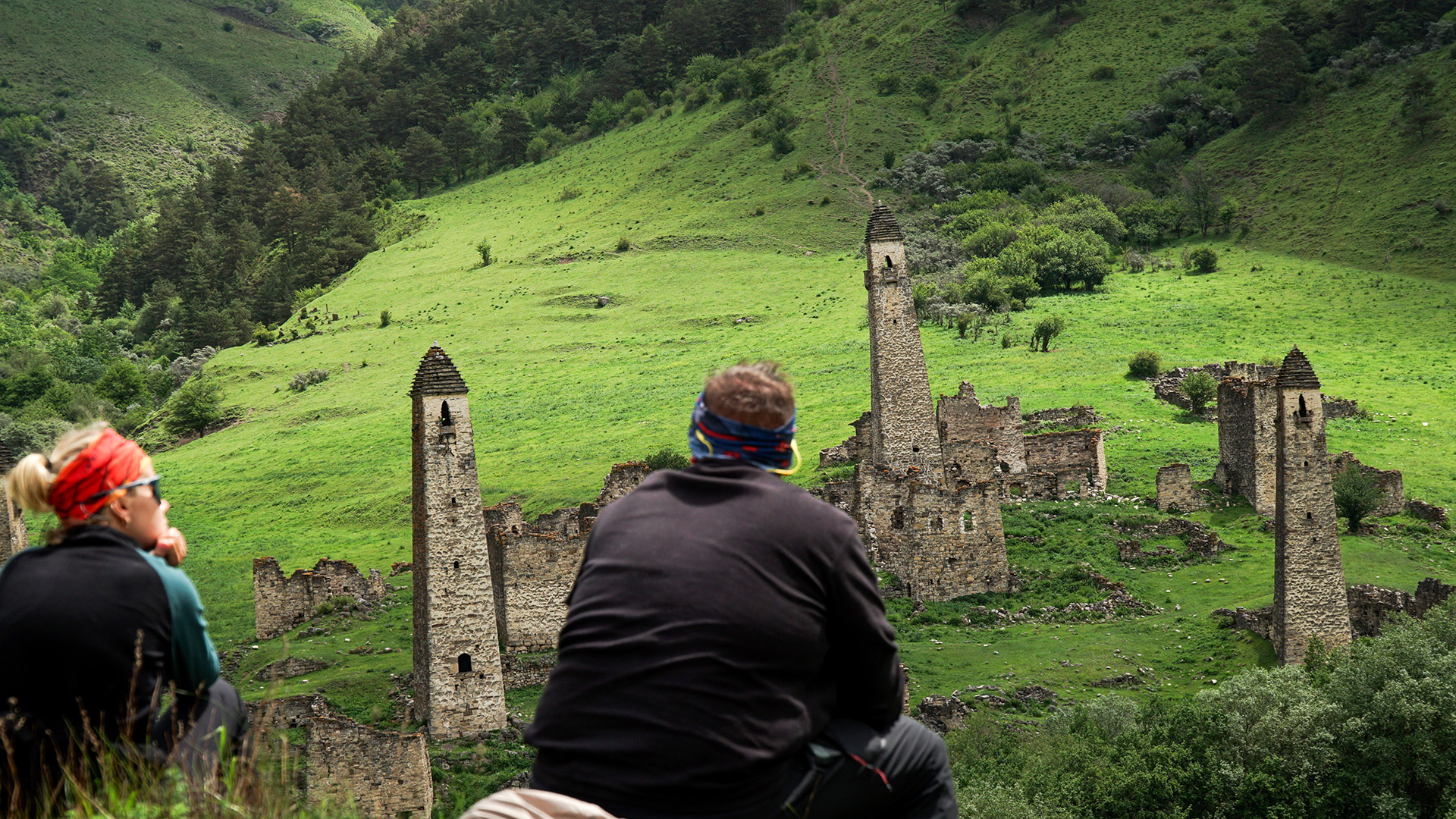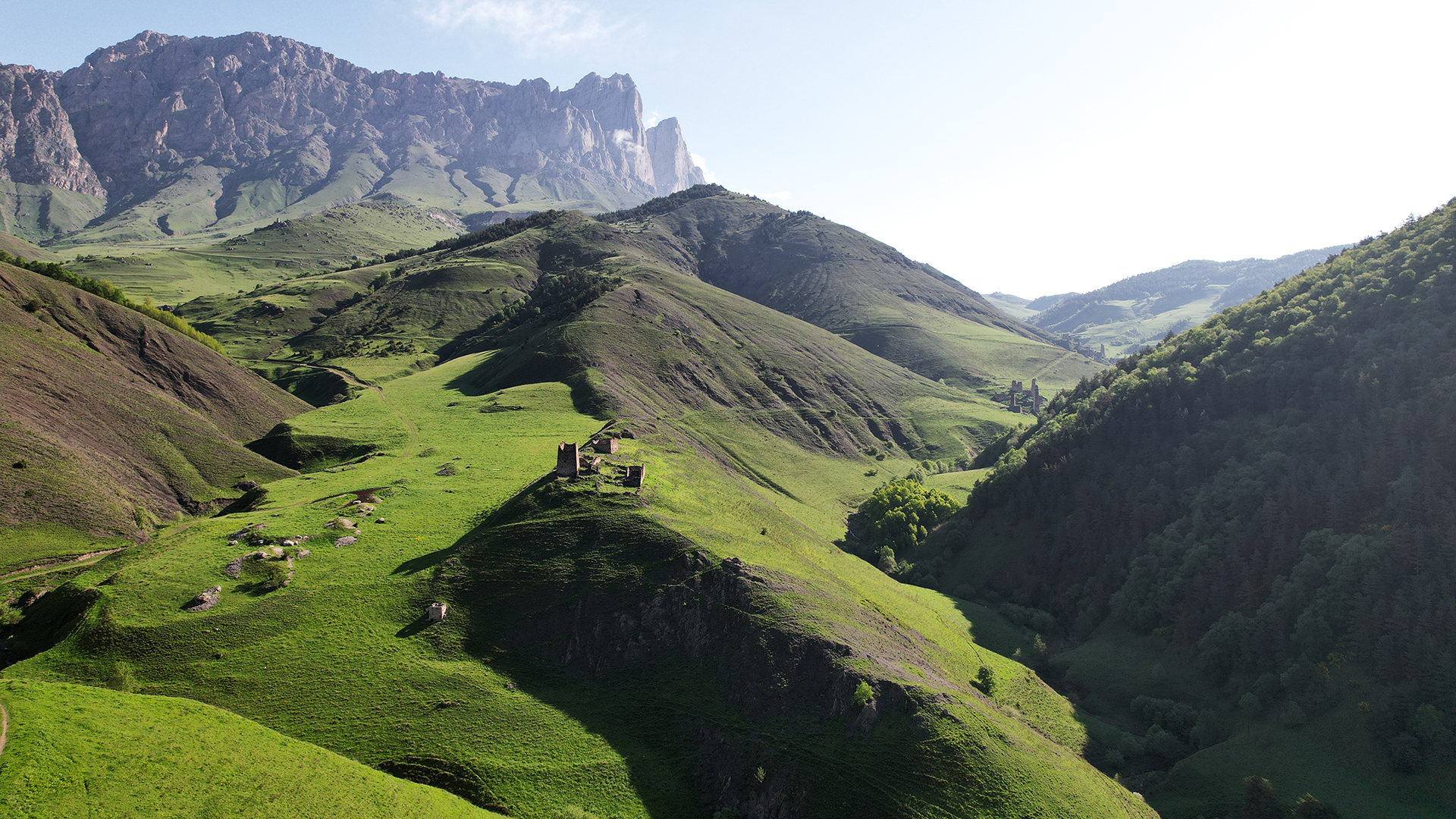 По живописной долине проходим сразу несколько групп родовых башен, а затем добираемся до одного из крупнейших башенных комплексов Ингушетии. Ставим лагерь на поляне у ручья по соседству с полуразрушенным древним поселением. Проводим вечер с видами на Казбек и заснеженные горные хребты.