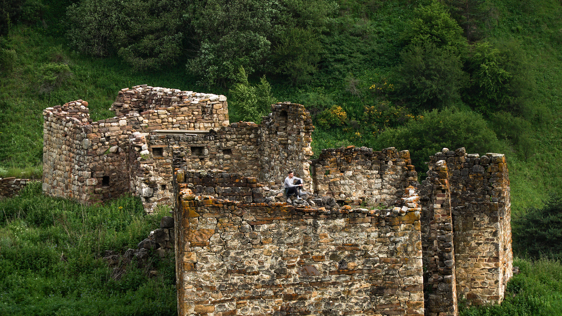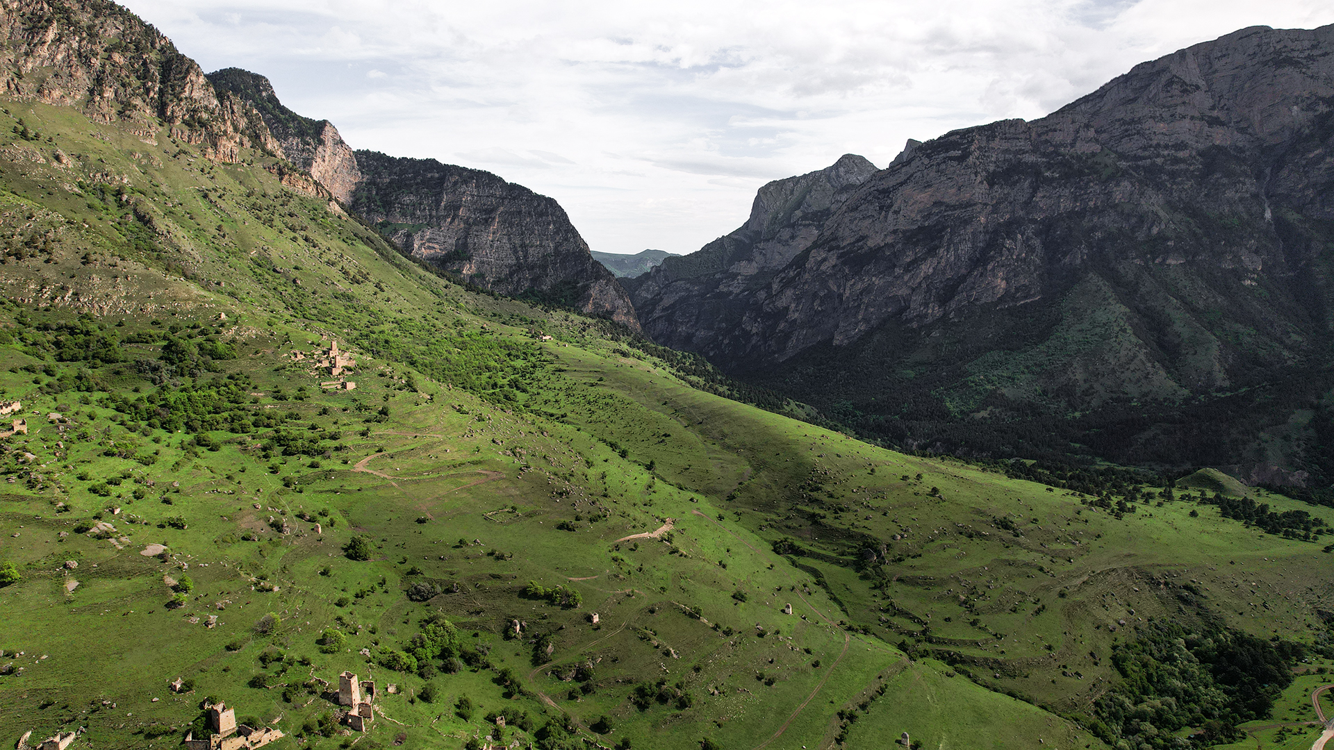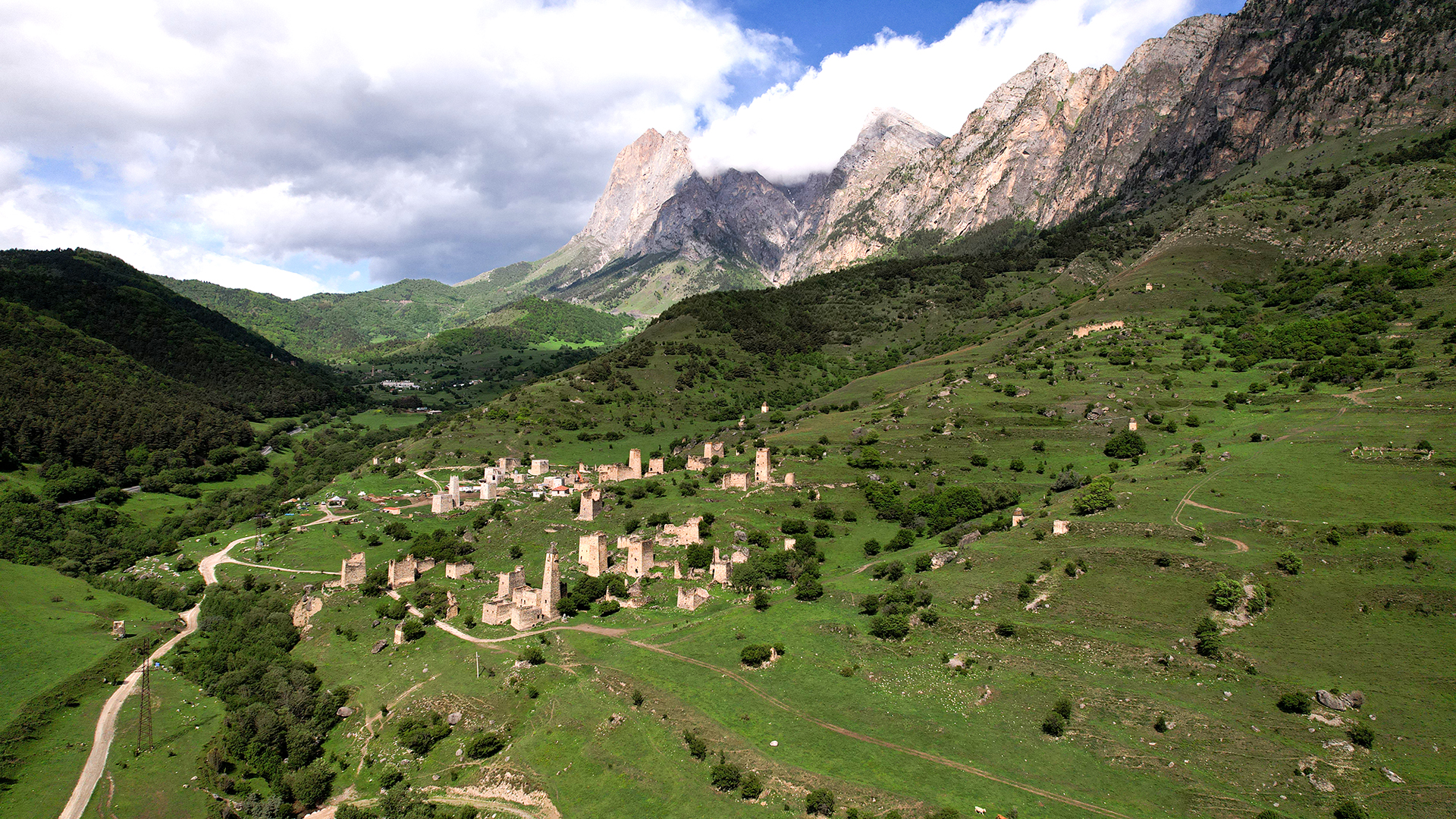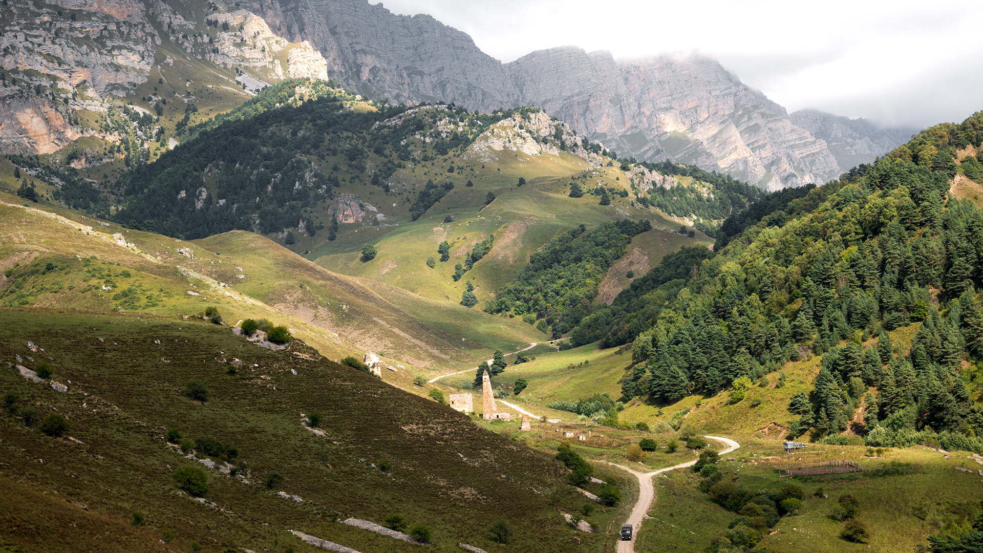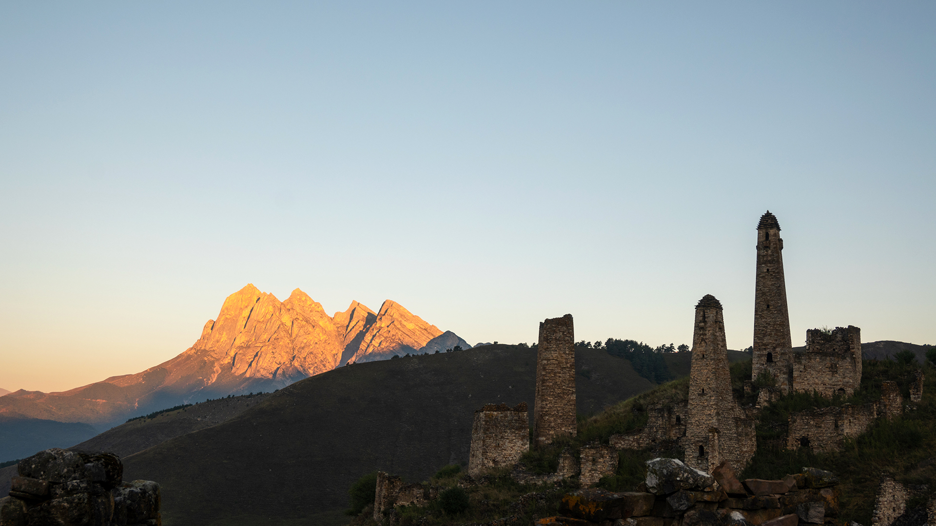 По живописной долине проходим сразу несколько групп родовых башен, а затем добираемся до одного из крупнейших башенных комплексов Ингушетии. Ставим лагерь на поляне у ручья по соседству с полуразрушенным древним поселением. Проводим вечер с видами на Казбек и заснеженные горные хребты.