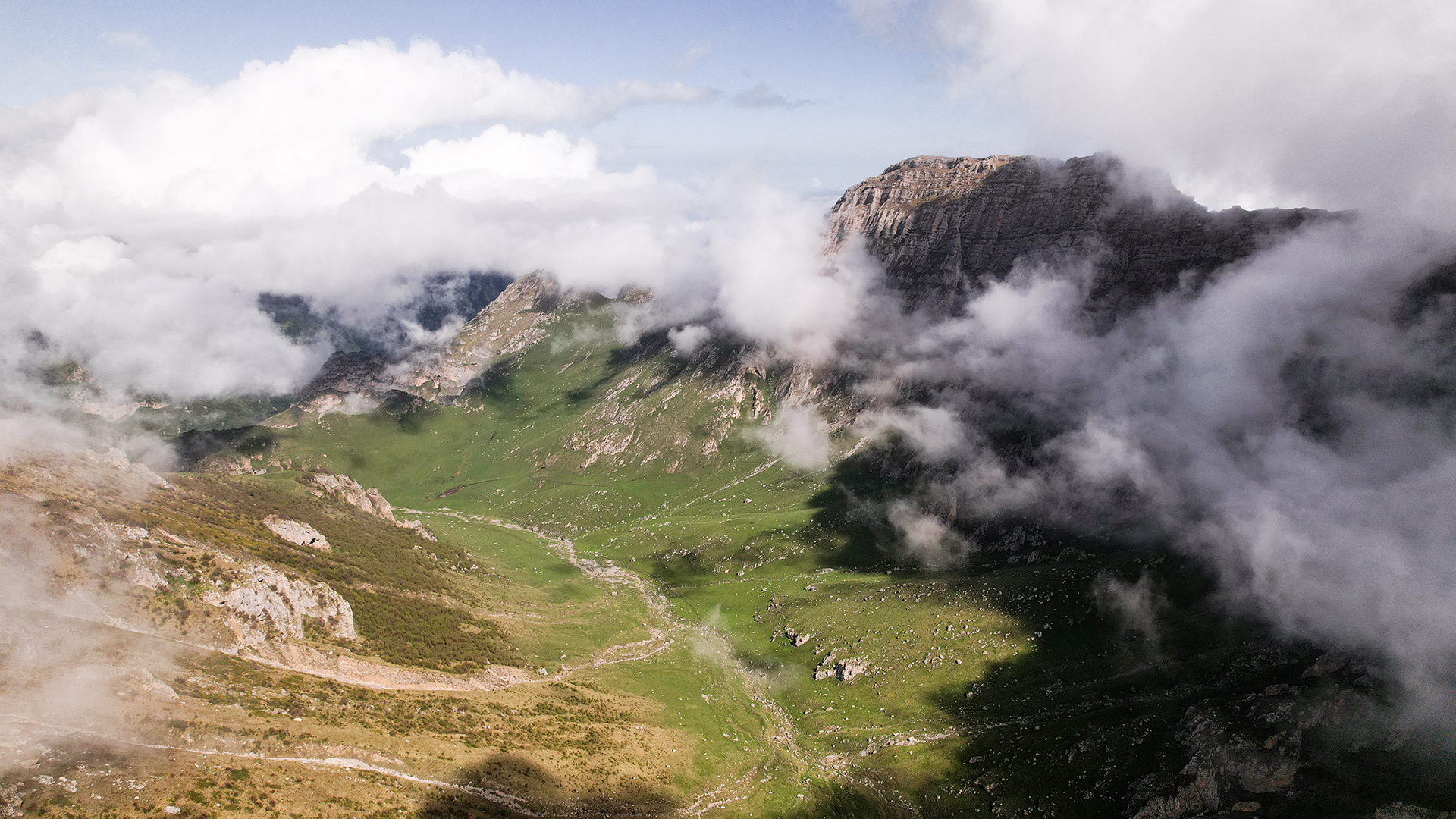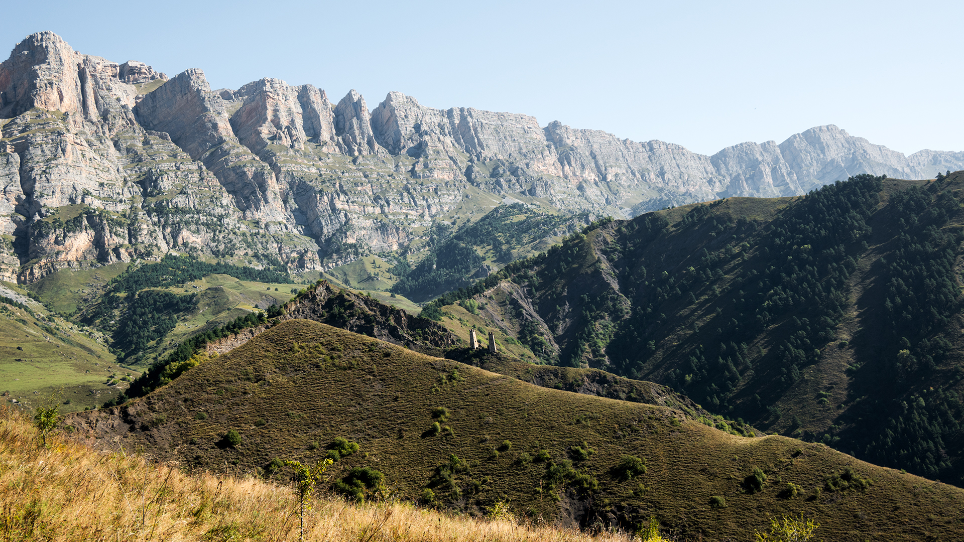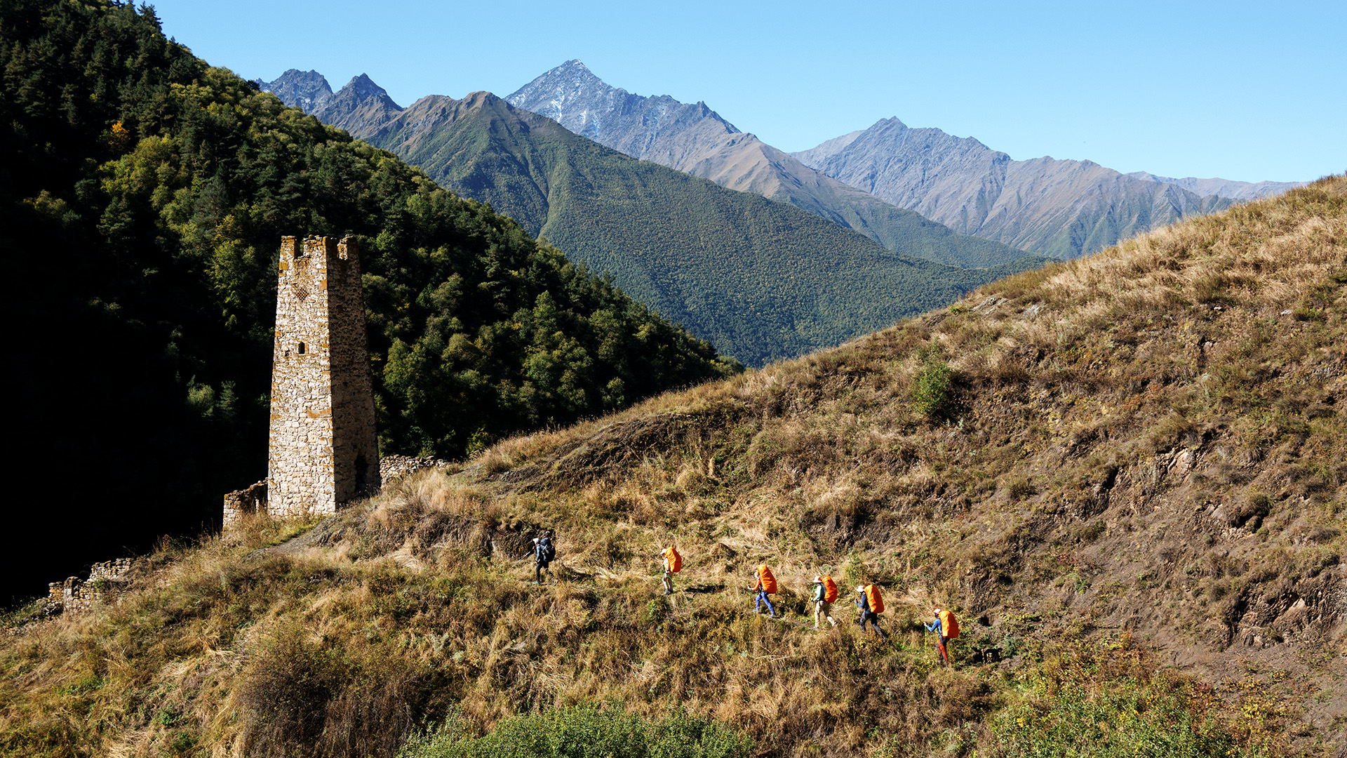 В первой половине дня нас ждет видовой переход по лугам и лесу к точке, где оставим рюкзаки — отсюда пойдем налегке к нескольким башенным комплексам. Возвращаемся, забираем рюкзаки и переходим по живописному горному гребню в соседнюю долину. После короткого подъема и спуска ставим лагерь в лесу с видом на долину и Главный Кавказский хребет.