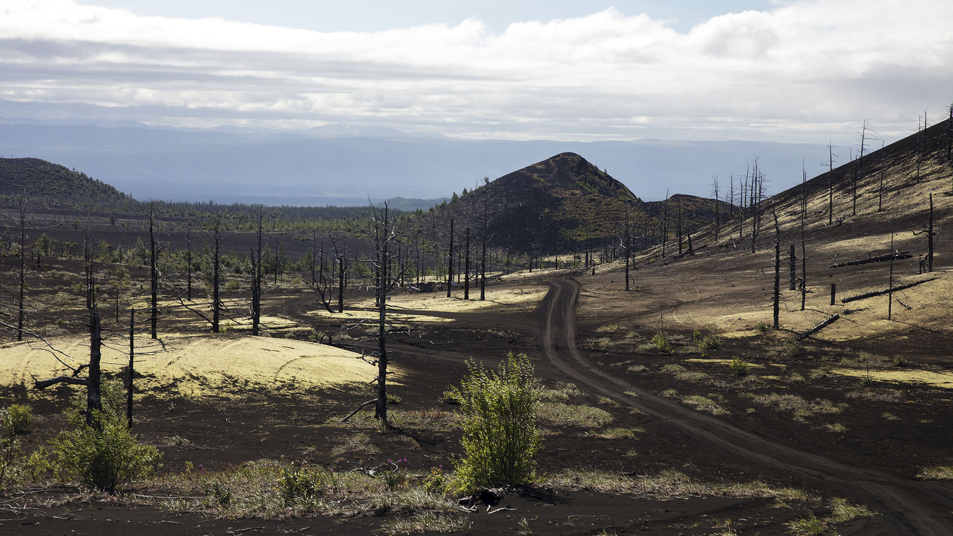 Самое время изучить окрестности Толбачика. Сегодня осмотрим Мёртвый лес, побываем в пещере кратера Звезда и поднимемся на конус Северного прорыва, чтобы увидеть последствия Большого трещинного Толбачинского извержения, которое произошло почти полвека назад — в 1975 году. На месте Мёртвого когда-то рос вполне зеленый лиственничный лес, а теперь здесь 40 квадратных километров выжженной земли, которую любят сравнивать с лунным пейзажем. Правда красиво!