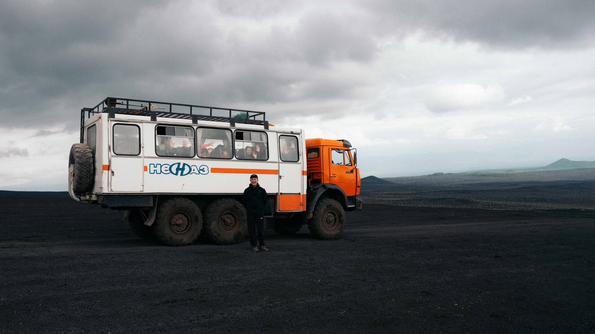 Сегодня выезжаем в сторону Авачинского вулкана (2741 м). Дорога займет примерно три часа. Наш путь лежит по руслу высохшей реки. Ночевать будем на базе с отличной панорамой: она расположена между вулканами Корякским (3456 м) и Авачинским. После ужина ляжем спать, чтобы восстановиться перед главным восхождением этой истории.