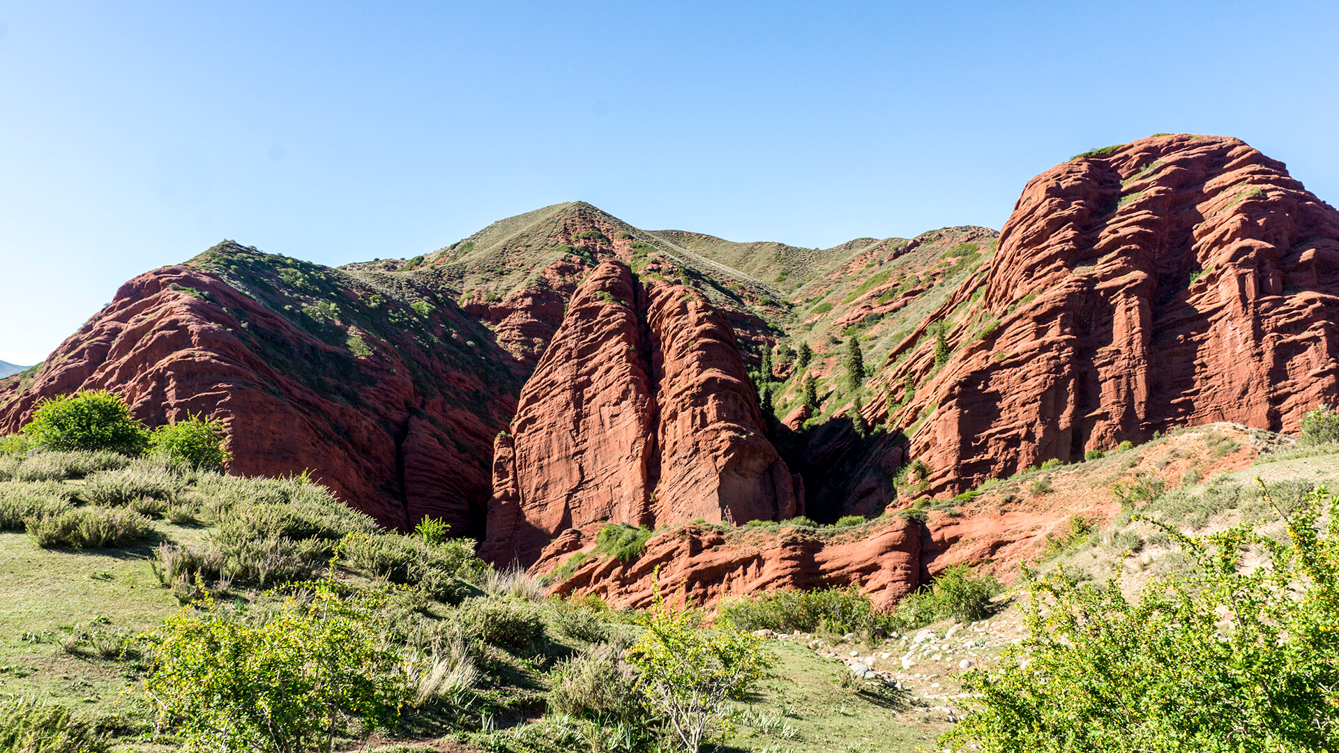 Трансфер довезет нас до стоянки в ущелье Жети-Огуз. По пути мы посмотрим скалу Семь быков, также известную как Разбитое сердце, и услышим красивую легенду о том, как эта скала появилась.