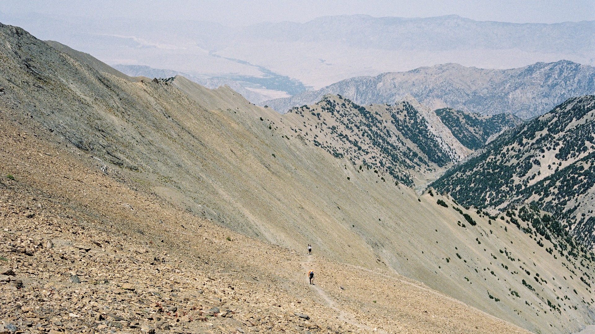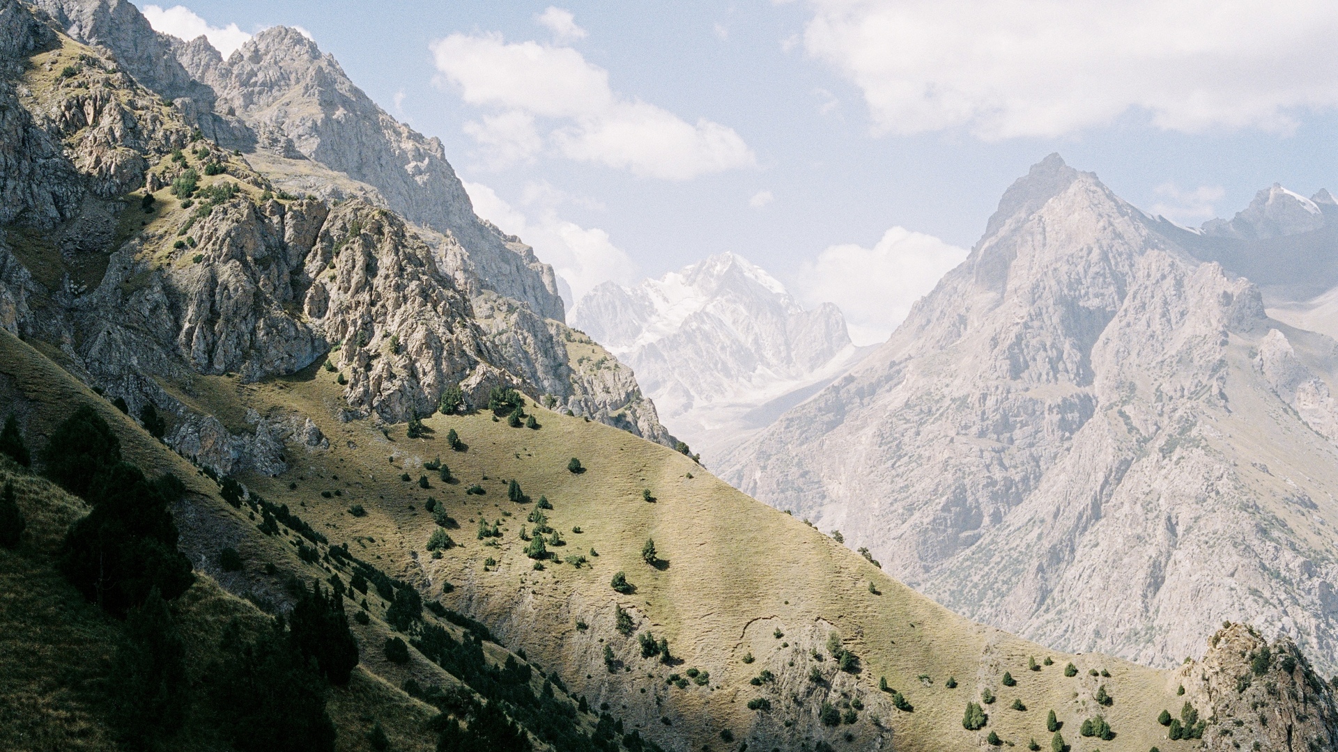 Перевал представляет собой пологую седловину и довольно широк. Отсюда открывается вид на множество остроконечных пиков Туркестанского хребта, к которым мы прогуляемся в следующие дни. Долгий спуск с большим сбросом высоты в долину реки Кара-Суу (2755), где разобьем лагерь на три ночи. Будем жить недалеко от коша местной семьи чабанов с видом на несколько красивых вершин.