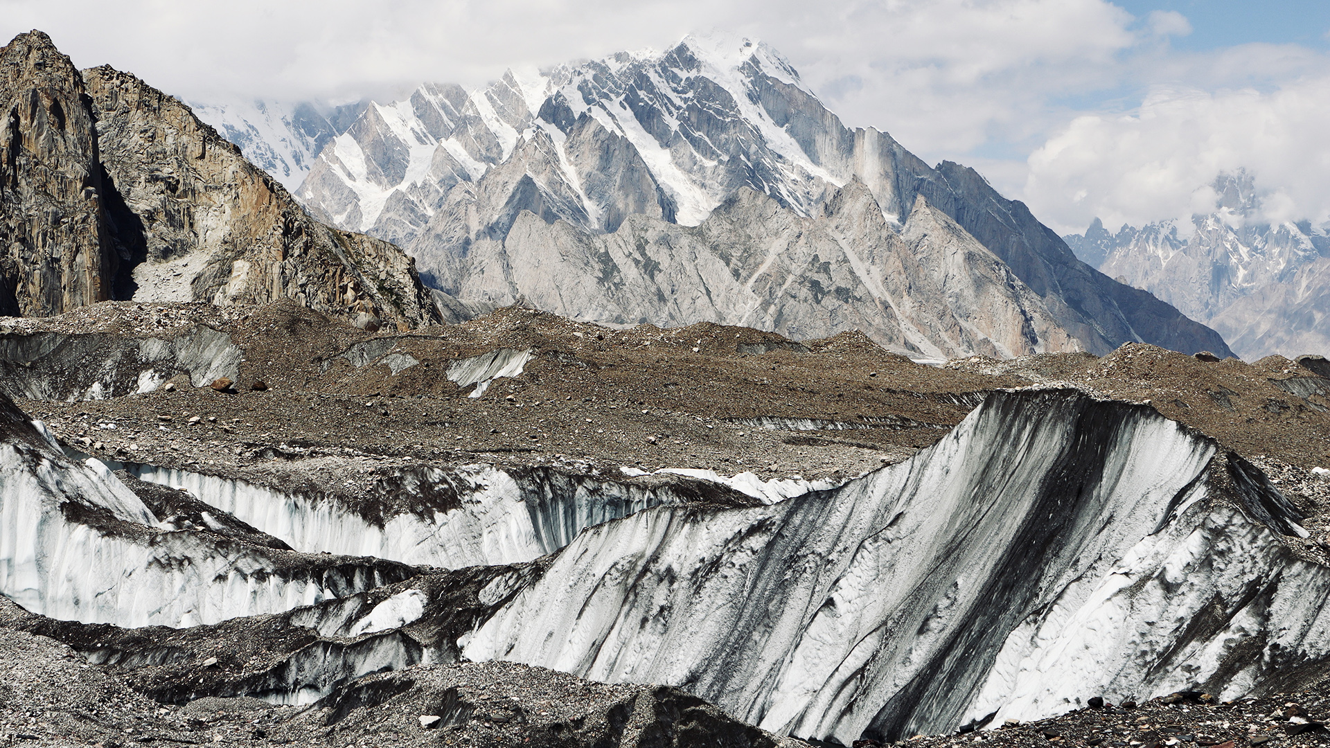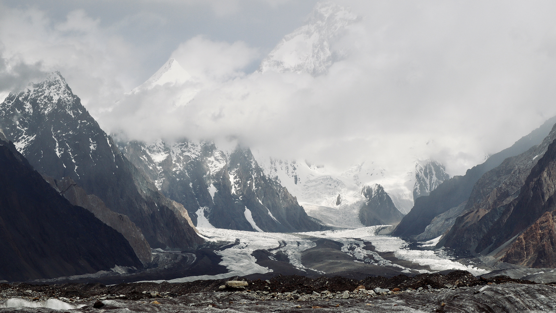 Переход в Горо II (4500 метров, 6–7 часов). Сложный переход через зону трещин. Тропа постепенно ведет нас вниз к центру ледника. Проходя между осыпями и нагромождением камней, идем по направлению к Гашербруму IV, где в углублении морены расположен высотный лагерь Горо II.