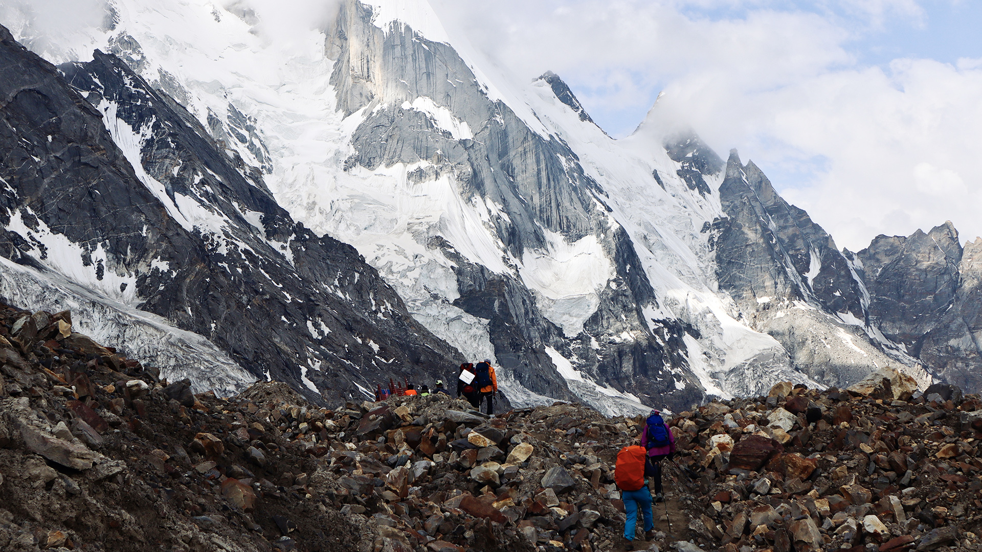 Начало трекинга, переход до Джула (3150 метров). Сегодня покидаем Асколе — последнее селение в долине. Подготовим снаряжение и багаж для портеров и выйдем на тропу в сторону Джула. Сначала встречаем ледник Биафо, пересекаем край ледника по морене. Ледник Биафо протяженностью 50 километров стекает с перевала Хиспар Ла. Уже сейчас начнем ощущать величие окружающих гор.