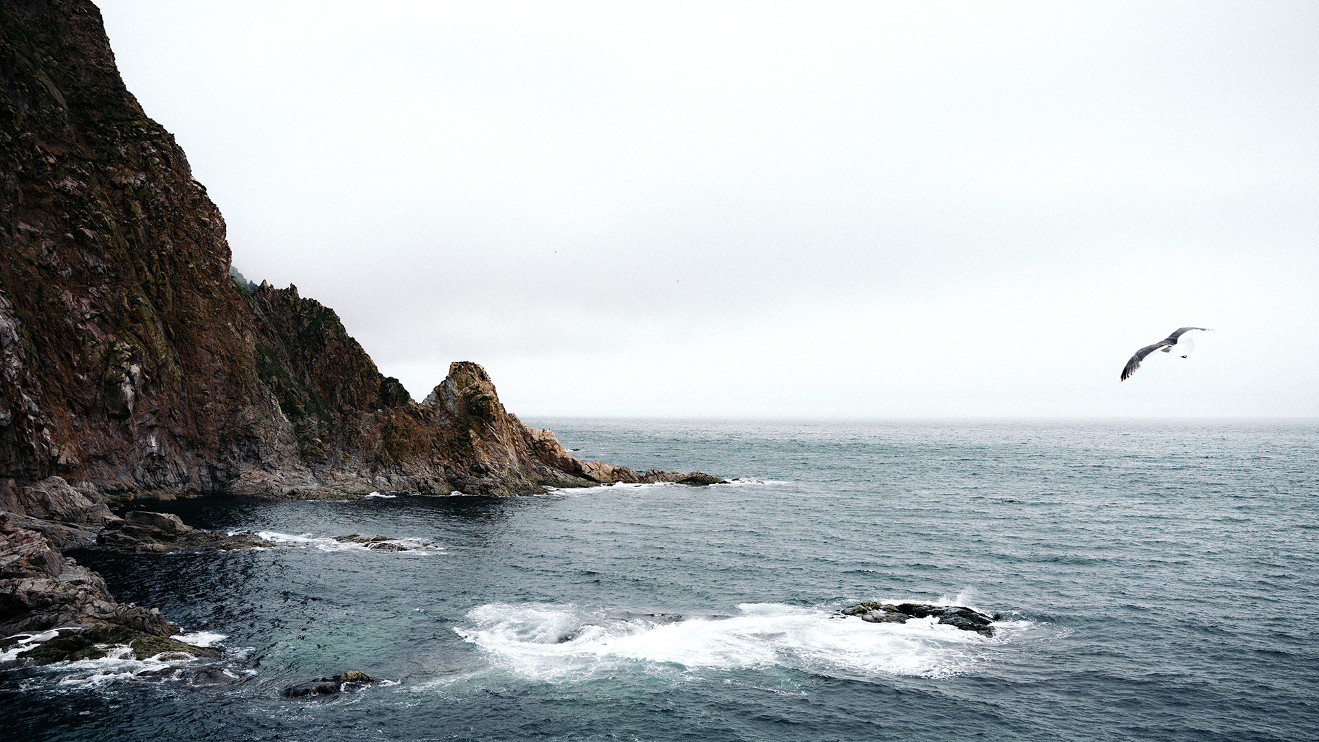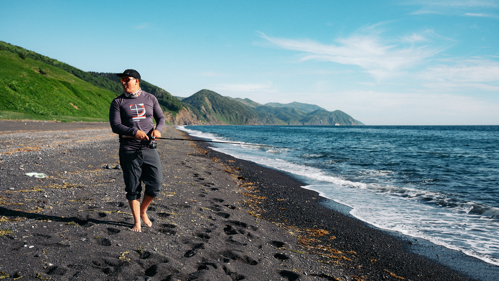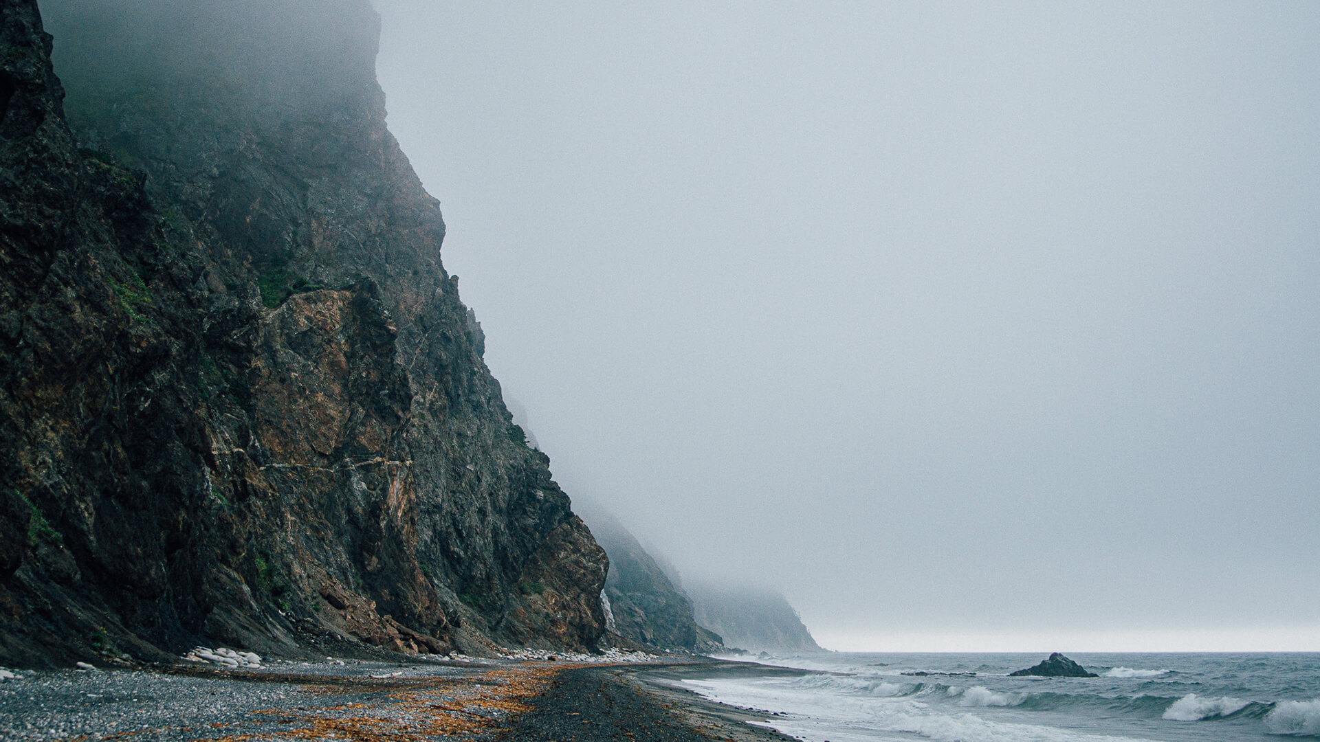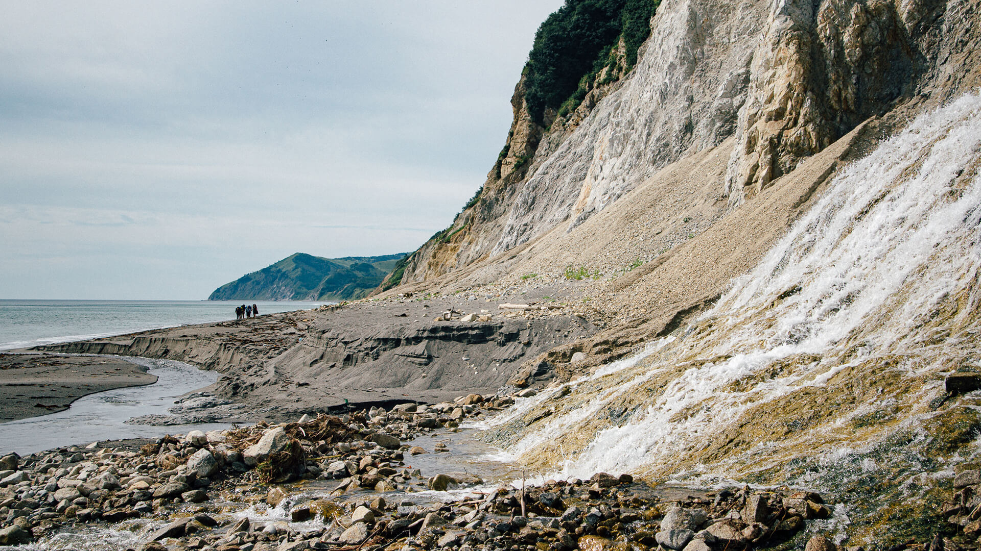 Продолжаем путь до скалы Белый Камень, проходим ее и устраиваем привал на обед. Затем переходим к подножию горы Крузенштерна, самой высокой точки Тонино-Анивского полуострова (670 м). Разбиваем лагерь на пляже у Нижней позиции — руин заброшенной военной базы.