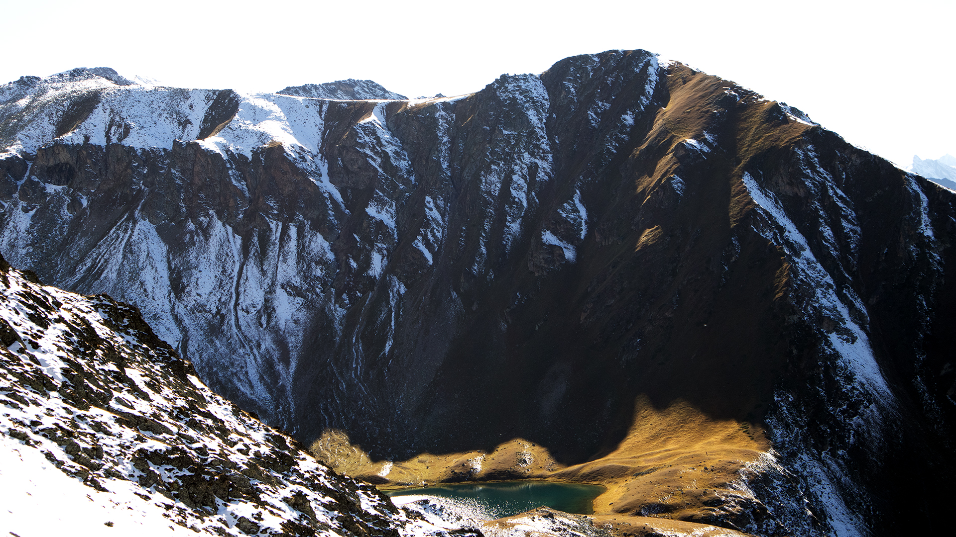 Просыпаемся пораньше и выходим на перевал по травянистому склону. Тропа вьется по крутому склону вниз — спускаемся в долину. После мимо каскада водопадов поднимаемся по скалистому ущелью и переходим по долине к группе разноцветных озер. Обедаем, отдыхаем, а затем преодолеваем крутой подъём по сыпухе и такой же спуск к озеру, с трех сторон зажатому скальными гребнями. Ставим лагерь на берегу озера.
