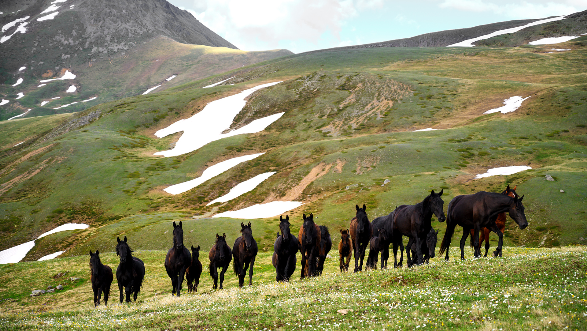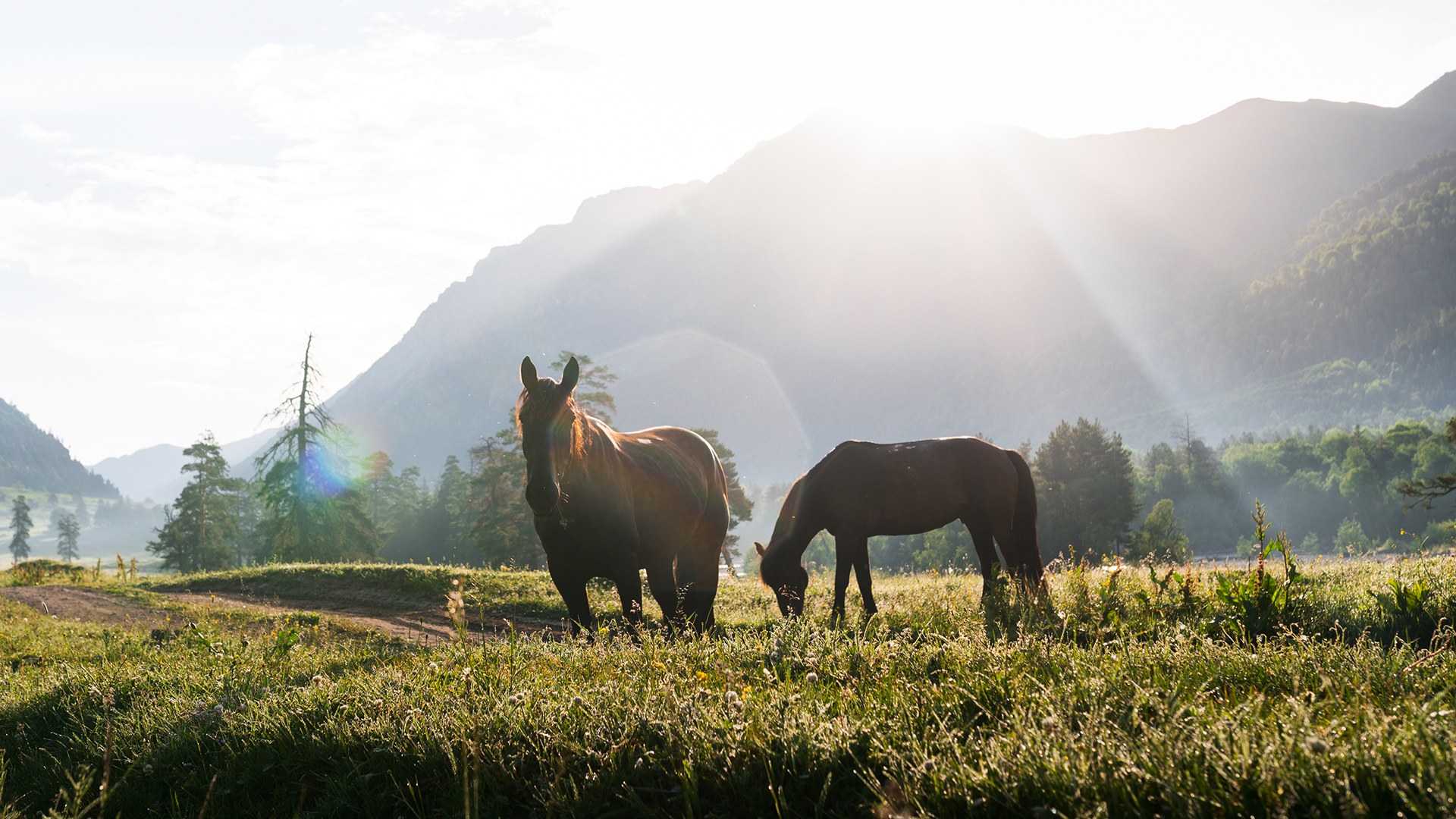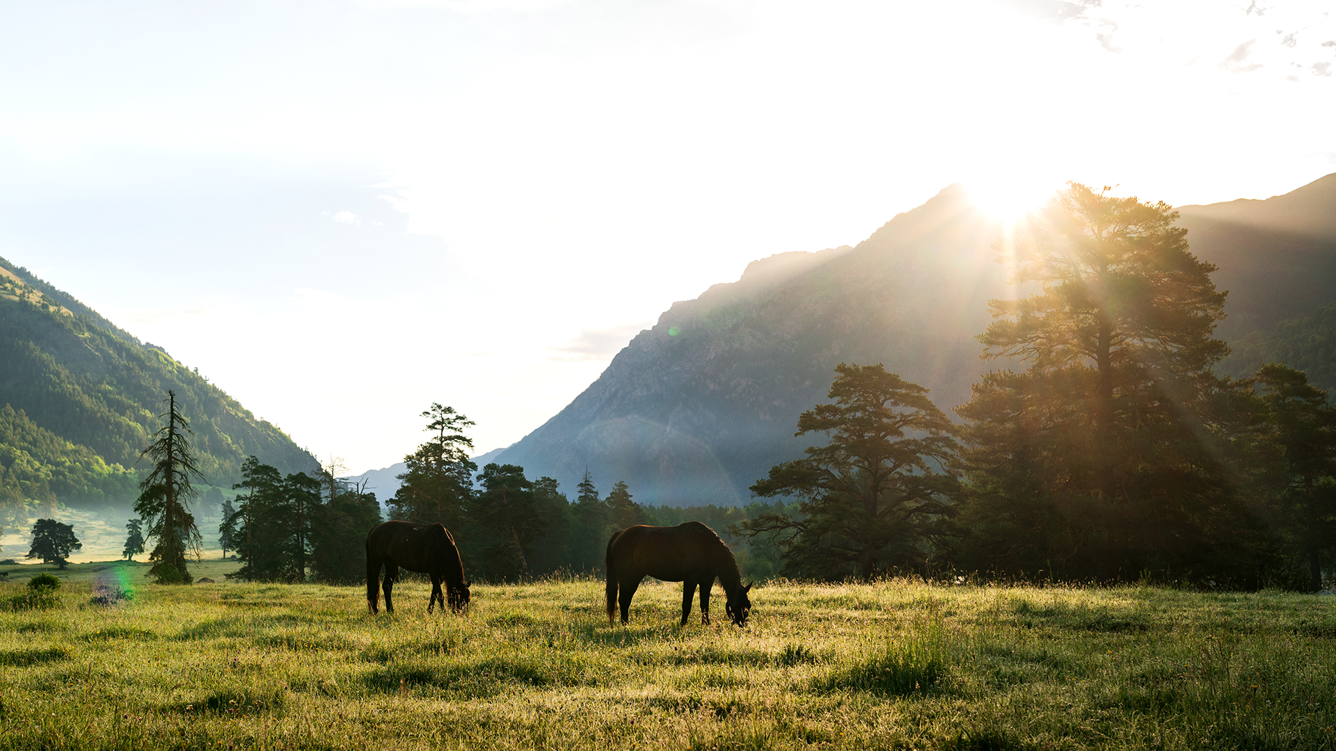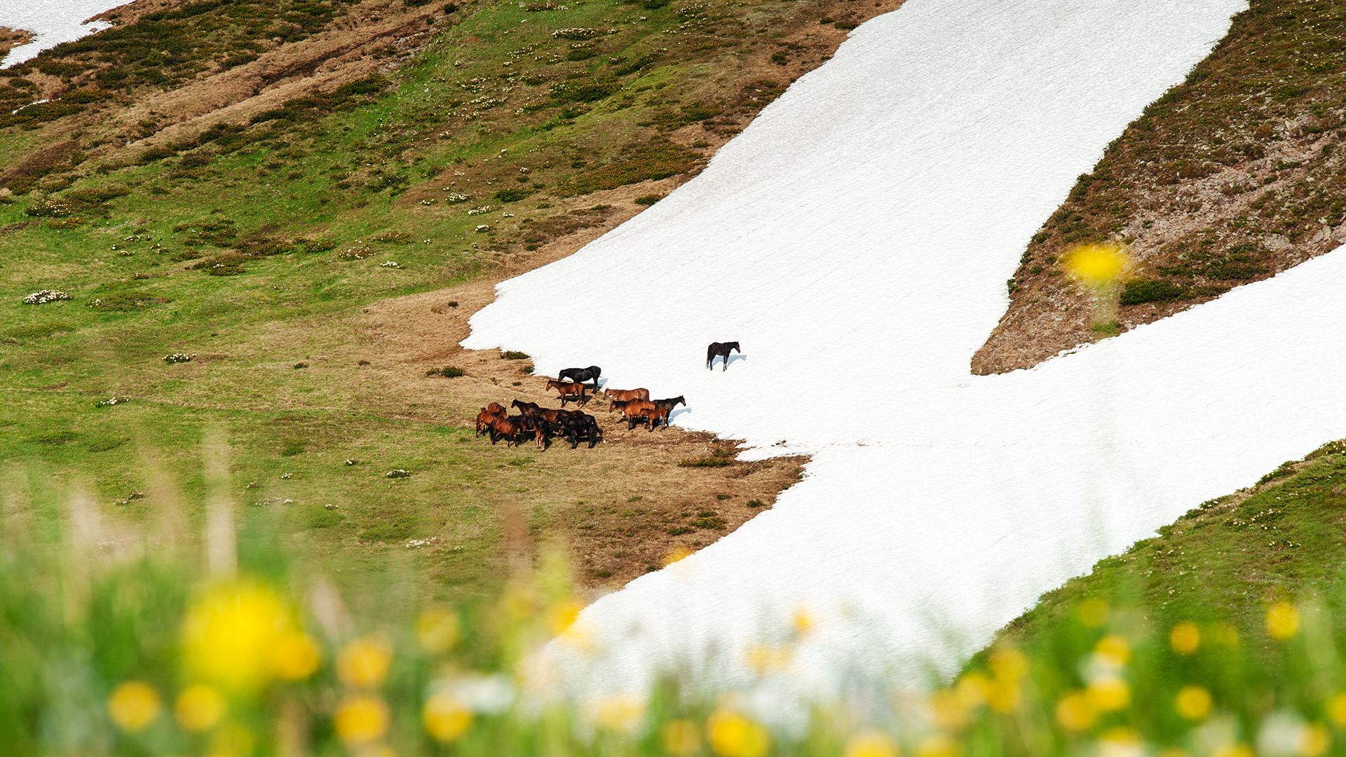 Поднимаемся в тенистом лесу по крутой тропе, натоптанной сотнями копыт. Выходим на альпийские луга и поднимаемся по долине вдоль ручья. Ставим лагерь на поляне и обедаем. Неподалеку пасутся овцы, лошади и коровы. После налегке поднимаемся к озерам, расположенным выше по ущелью. Возвращаемся в лагерь.